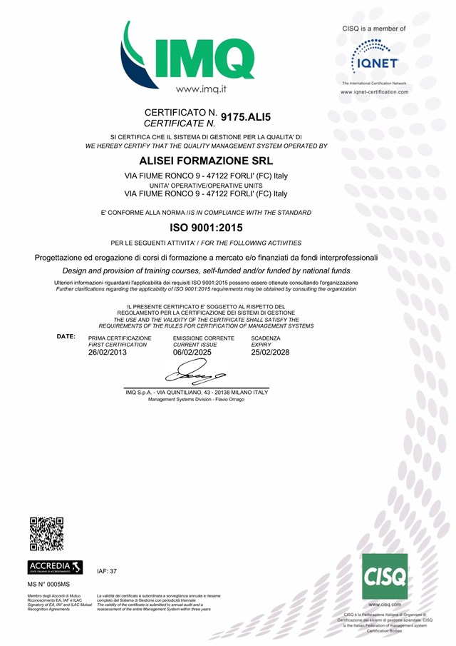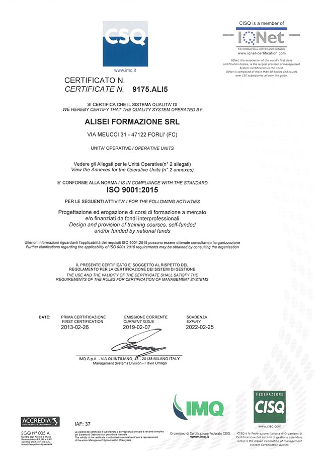 Alisei Formazione è un'azienda certificata UNI EN ISO 9001 - settore EA 37 - per la progettazione ed erogazione di percorsi formativi.